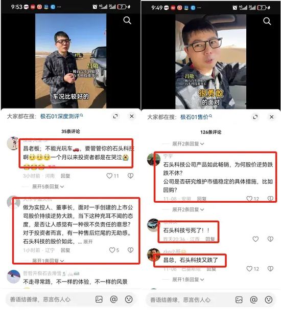 于是,当他共享“雪地越野和沙漠越野谁挑战更大”时,评述区点赞最多的实质是:“昌雇主,不行光玩车,管管你的石头科技吧,一个月以来投资者齐在饮泣。”